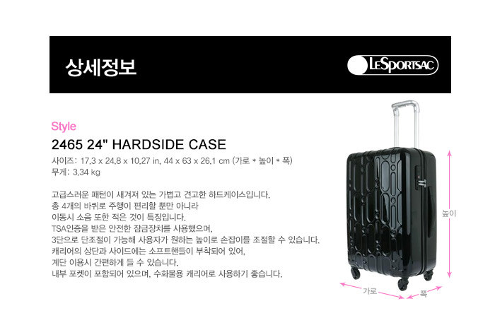| 레스포색의 유니크한 로고를 연상케 하는 라운드 패턴이 적용된 핑크 / 원단 재단에 따라 상품의 프린트 된 패턴이 조금씩 상이할 수 있습니다. | |