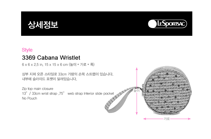 상부 지퍼 오픈 스타일로 33cm 가량의 손목 스트랩이 있습니다. Zip top main closure 13”/ 33cm wrist strap .75” web strap Interior slide pocket No Pouch