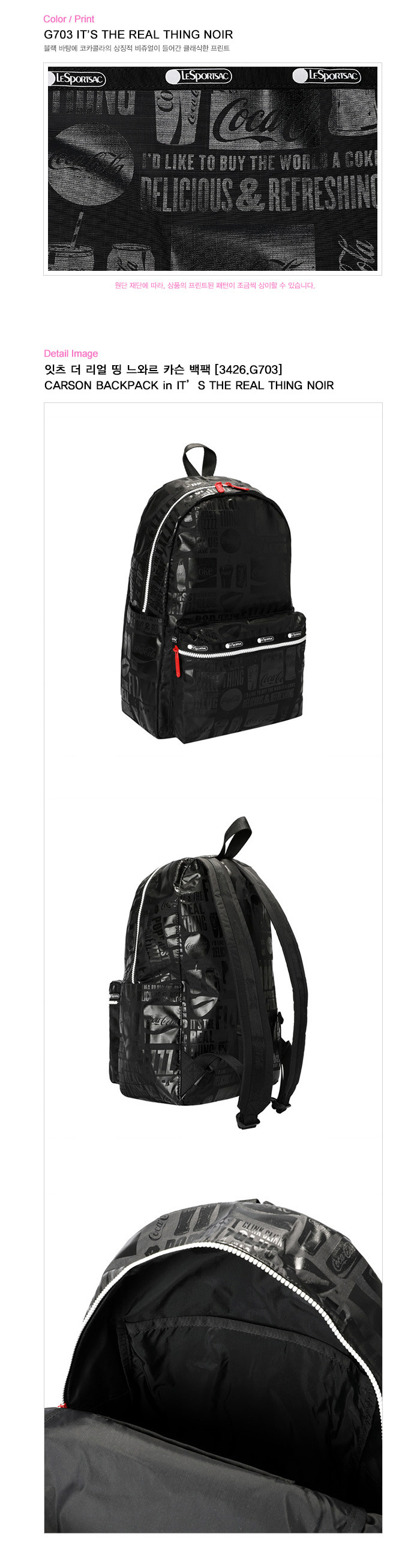 블랙 바탕에 코카콜라의 상징적 비쥬얼이 들어간 클래식한 프린트 / 원단 재단에 따라 상품의 프린트 된 패턴이 조금씩 상이할 수 있습니다. | |