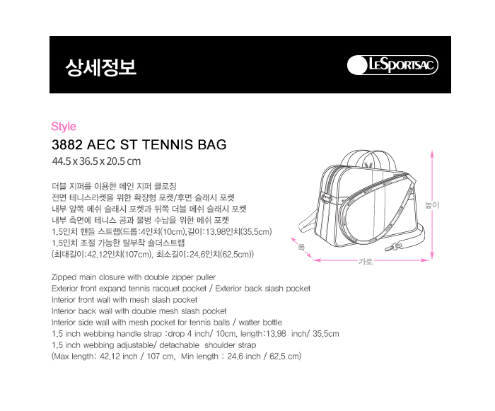 더블 지퍼를 이용한 메인 지퍼 클로징 전면 테니스라켓을 위한 확장형 포켓 후면 슬래시 포켓 내부 앞쪽 메쉬 슬래시 포켓과 뒤쪽 더블 메쉬 슬래시 포켓 내부 측면에 테니스 공과 물병 수납을 위한 메쉬 포켓 1.5인치 핸들 스트랩(드롭:4인치(10cm),길이:13.98인치(35.5cm) 1.5인치 조절 가능한 탈부착 숄더스트랩(최대길이:42.12인치(107cm), 최소길이:24.6인치(62.5cm)) |