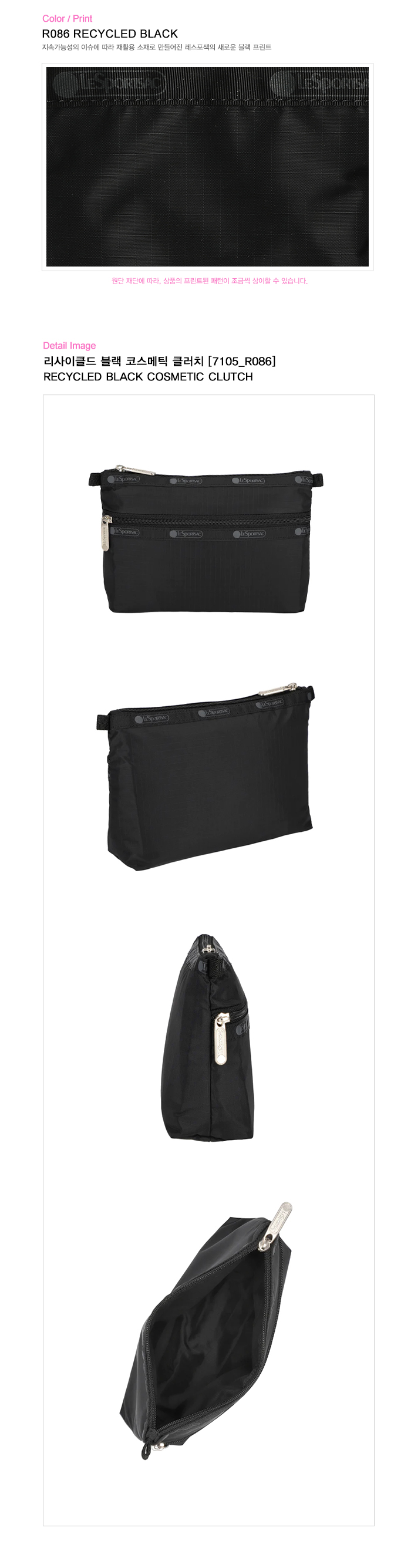 지속가능성의 이슈에 따라 재활용 소재로 만들어진 레스포색의 새로운 블랙 프린트. / 원단 재단에 따라 상품의 프린트 된 패턴이 조금씩 상이할 수 있습니다. | |