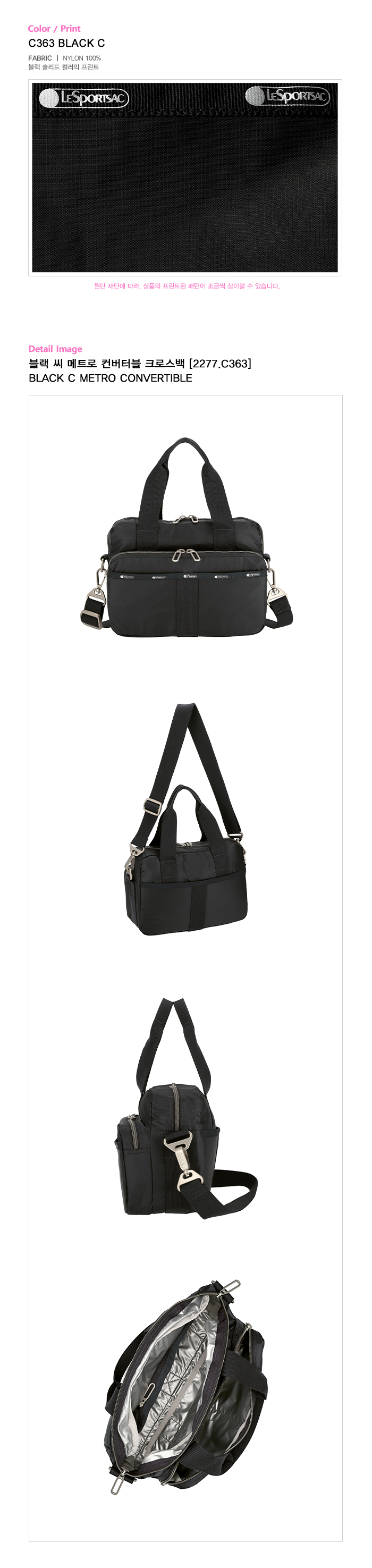 지퍼 클로저 처리된 컨버터블 백으로 15 cm 길이의 손잡이와 탈부착과 길이 조절이 가능한 크로스바디 스트랩이 포함되어 있다. (최대 : 132 cm) 앞면과 뒷면에는 자석 스냅 처리 된 슬라이드 포켓이 있으며 내부에는 1개의 지퍼 포켓이 있다. |
