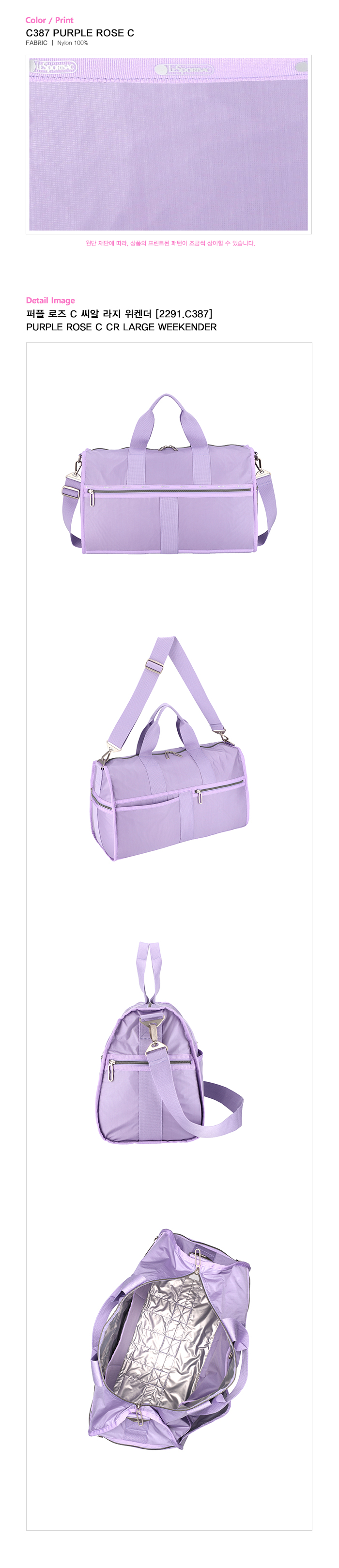 지퍼 클로저 처리된 여행용 라지 사이즈 가방으로 7.5 in / 19 cm 길이의 짧은 손잡이와 탈부착과 길이 조절이 가능한 크로스바디 스트랩이 포함되어 있다. ( 42 in / 107 cm) 가방 앞면에는 지퍼 포켓이 있다. |