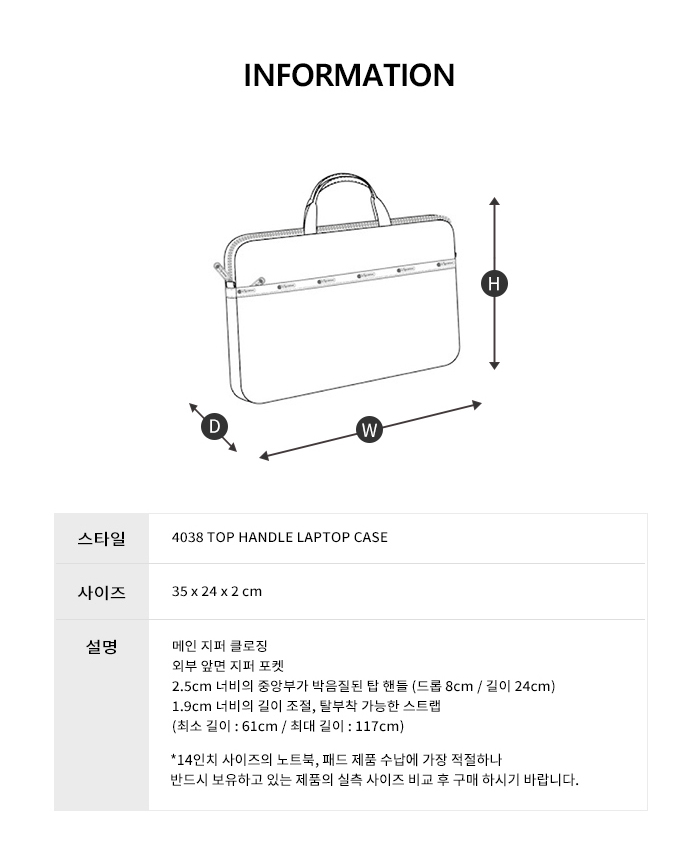 메인 지퍼 클로징 외부 앞면 지퍼 포켓 2.5cm 너비의 중앙부가 박음질된 탑 핸들 (드롭 8 cm / 길이 24 cm) 1.9cm 너비의 길이 조절, 탈부착 가능한 스트랩 (최소 길이 : 61 cm / 최대 길이 : 117 cm)
