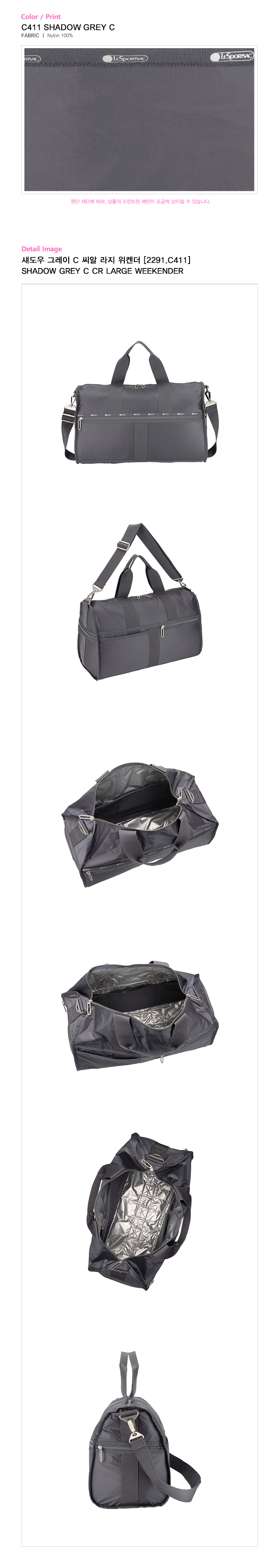 지퍼 클로저 처리된 여행용 라지 사이즈 가방으로 7.5 in / 19 cm 길이의 짧은 손잡이와 탈부착과 길이 조절이 가능한 크로스바디 스트랩이 포함되어 있다. ( 42 in / 107 cm) 가방 앞면에는 지퍼 포켓이 있다. |