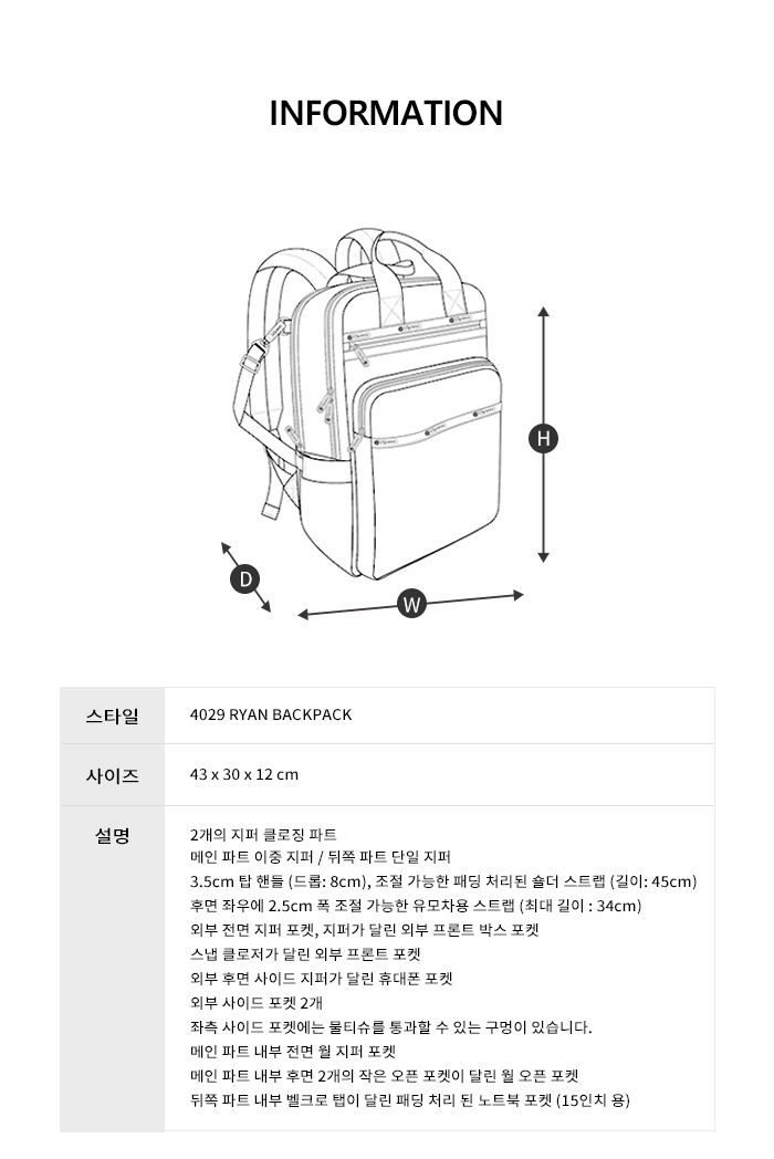 - 2개의 지퍼 클로징 파트 - 메인 파트 이중 지퍼 / 뒤쪽 파트 단일 지퍼 - 3.5cm 탑 핸들(드롭: 8cm), 조절 가능한 패딩 처리된 숄더 스트랩(길이: 45cm) - 후면 좌우에 2.5cm 폭 조절 가능한 유모차용 스트랩 (최대 길이 : 34cm - 외부 전면 지퍼 포켓, 지퍼가 달린 외부 프론트 박스 포켓 - 스냅 클로저가 달린 외부 프론트 포켓 - 외부 후면 사이드 지퍼가 달린 휴대폰 포켓 - 외부 사이드 포켓 2개 - 좌측 사이드 포켓에는 물티슈를 통과할 수 있는 구멍이 있습니다. - 메인 파트 내부 전면 월 지퍼 포켓 - 메인 파트 내부 후면 2개의 작은 오픈 포켓이 달린 월 오픈 포켓 - 뒤쪽 파트 내부 벨크로 탭이 달린 패딩 처리 된 노트북 포켓 (15인치 용)