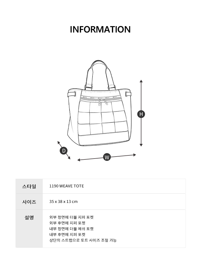 - 외부 정면에 더블 지퍼 포켓 - 외부 후면에 지퍼 포켓 - 내부 정면에 더블 메쉬 포켓 - 내부 후면에 지퍼 포켓 - 상단의 스트랩으로 토트 사이즈 조절 가능