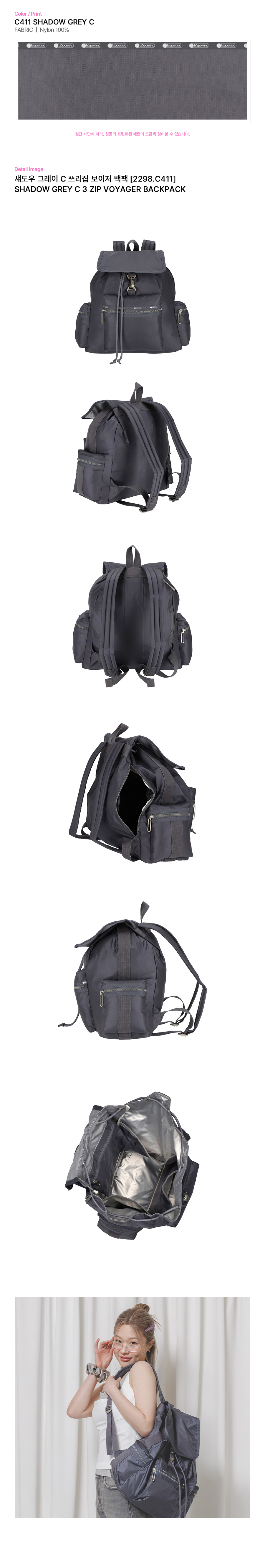 - 조임끈과 버클 부속품으로 클로저 처리된 백팩 - 가방 상단에 덮개가 있는 스타일 - 패딩 처리된 길이 조절이 가능한 어깨끈 - 외부 전면 3개의 지퍼 포켓 - 내부 후면 1개의 지퍼 포켓 - 내부 전면, 양 측면의 슬라이드 포켓 |