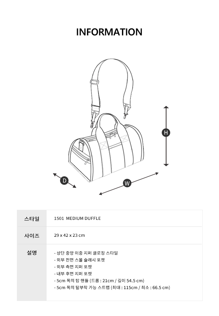 - 상단 중앙 이중 지퍼 클로징 스타일 - 외부 전면 스몰 슬래시 포켓 - 외부 측면 지퍼 포켓 - 내부 후면 지퍼 포켓 - 5cm 폭의 탑 핸들 (드롭 : 21cm / 길이 54.5 cm) - 5cm 폭의 탈부착 가능 스트랩 (최대 : 115cm / 최소 : 66.5 cm) |