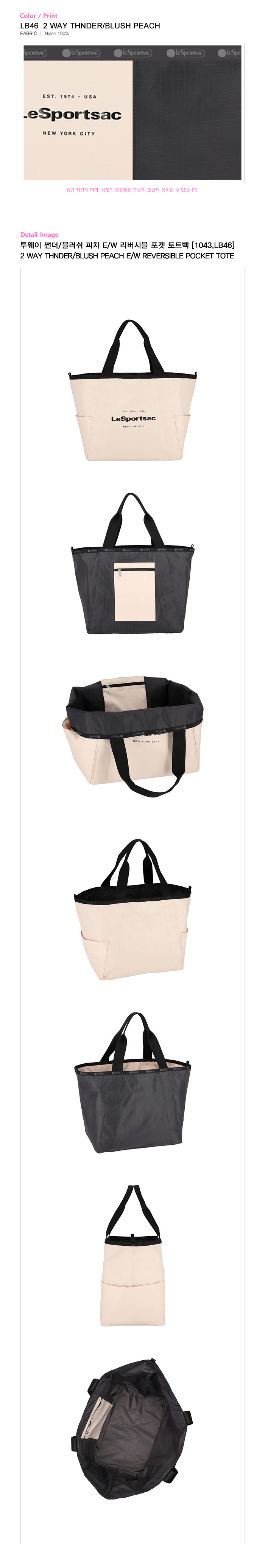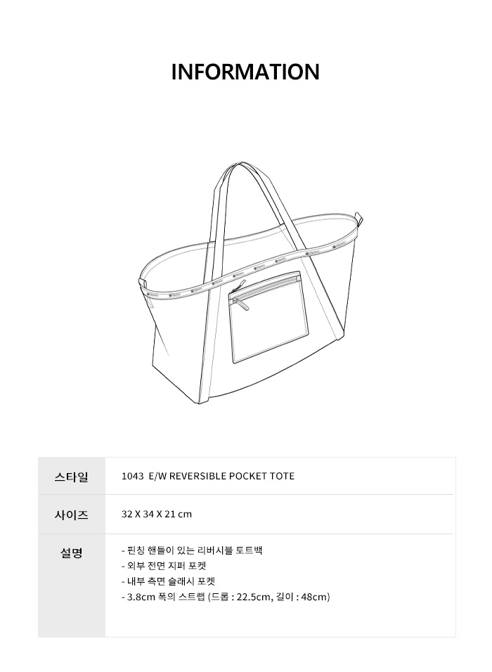 - 핀칭 핸들이 있는 리버시블 토트백 - 외부 전면 지퍼 포켓 - 내부 측면 슬래시 포켓 - 3.8cm 폭의 스트랩 (드롭 : 22.5cm, 길이 : 48cm)