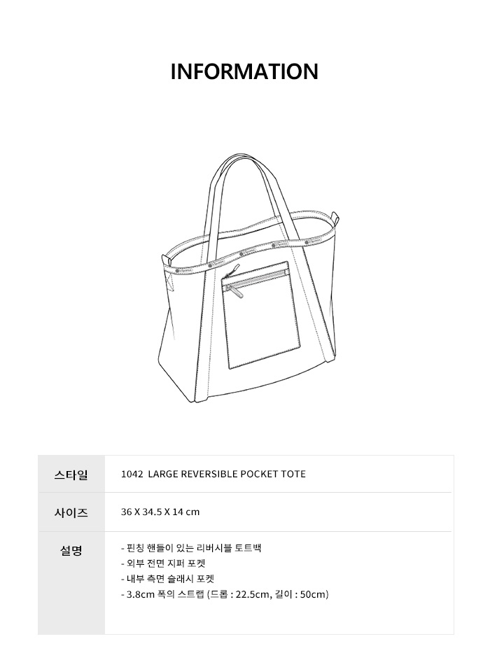 - 핀칭 핸들이 있는 리버시블 토트백 - 외부 전면 지퍼 포켓 - 내부 측면 슬래시 포켓 - 3.8cm 폭의 스트랩 (드롭 : 22.5cm, 길이 : 50cm)