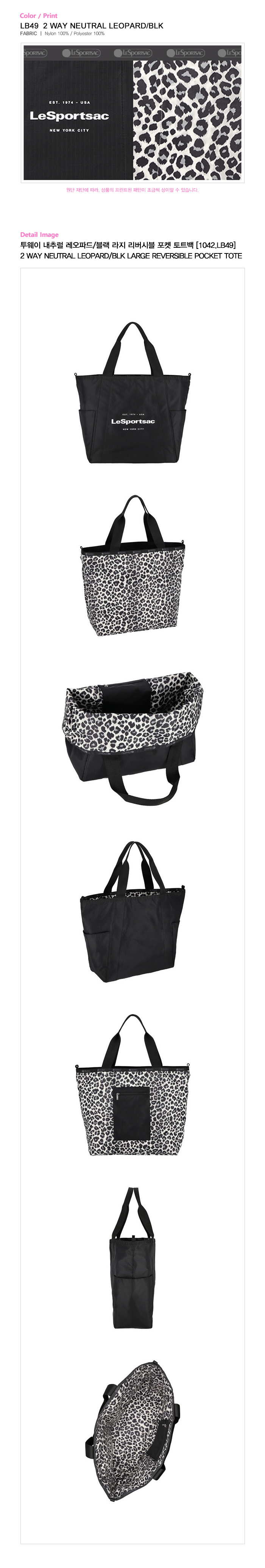 - 핀칭 핸들이 있는 리버시블 토트백 - 외부 전면 지퍼 포켓 - 내부 측면 슬래시 포켓 - 3.8cm 폭의 스트랩 (드롭 : 22.5cm, 길이 : 50cm)