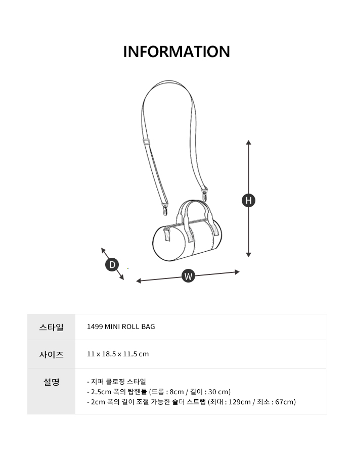 - 지퍼 클로징 스타일 - 2.5cm 폭의 탑핸들 (드롭 : 8cm / 길이 : 30 cm) - 2cm 폭의 길이 조절 가능한 숄더 스트랩 (최대 : 129cm / 최소 : 67cm)