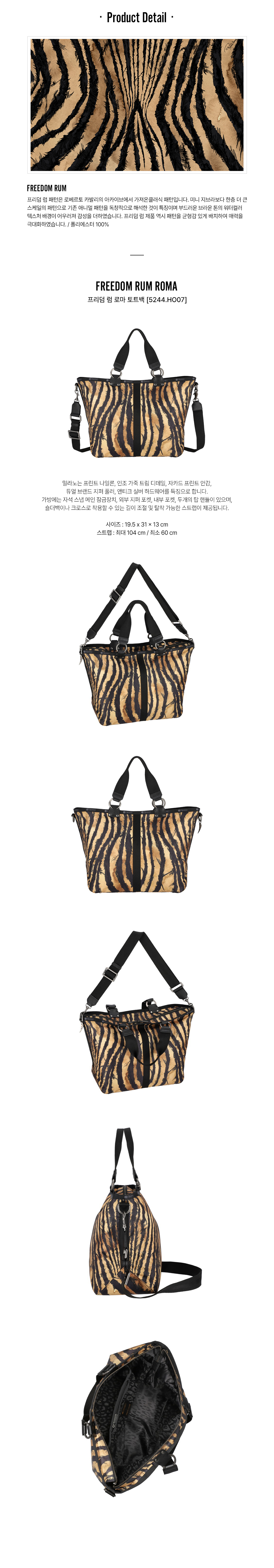로마는 프린트 나일론, 인조 가죽 트림 디테일, 자카드 프린트 안감, 앤티크 실버 하드웨어를 특징으로 하는 토트백 입니다. 지퍼 탑 메인 클로저와 내부 포켓, 외부 히든 지퍼 포켓과 두개의 탑 핸들이 있으며, 숄더백이나 크로스로 착용할 수 있는 길이 조절 및 탈착 가능한 스트랩이 제공됩니다. 사이즈 : 30 x 47.5 x 17 cm 스트랩 : 최대 106 cm / 최소 61 cm |