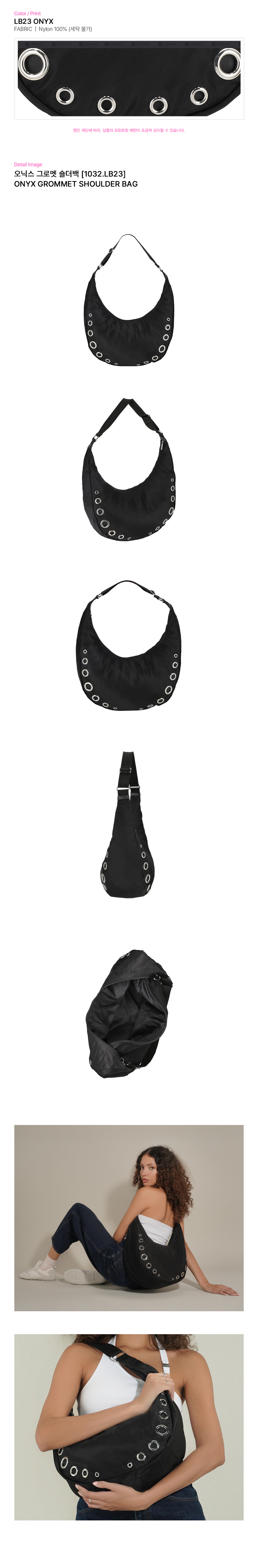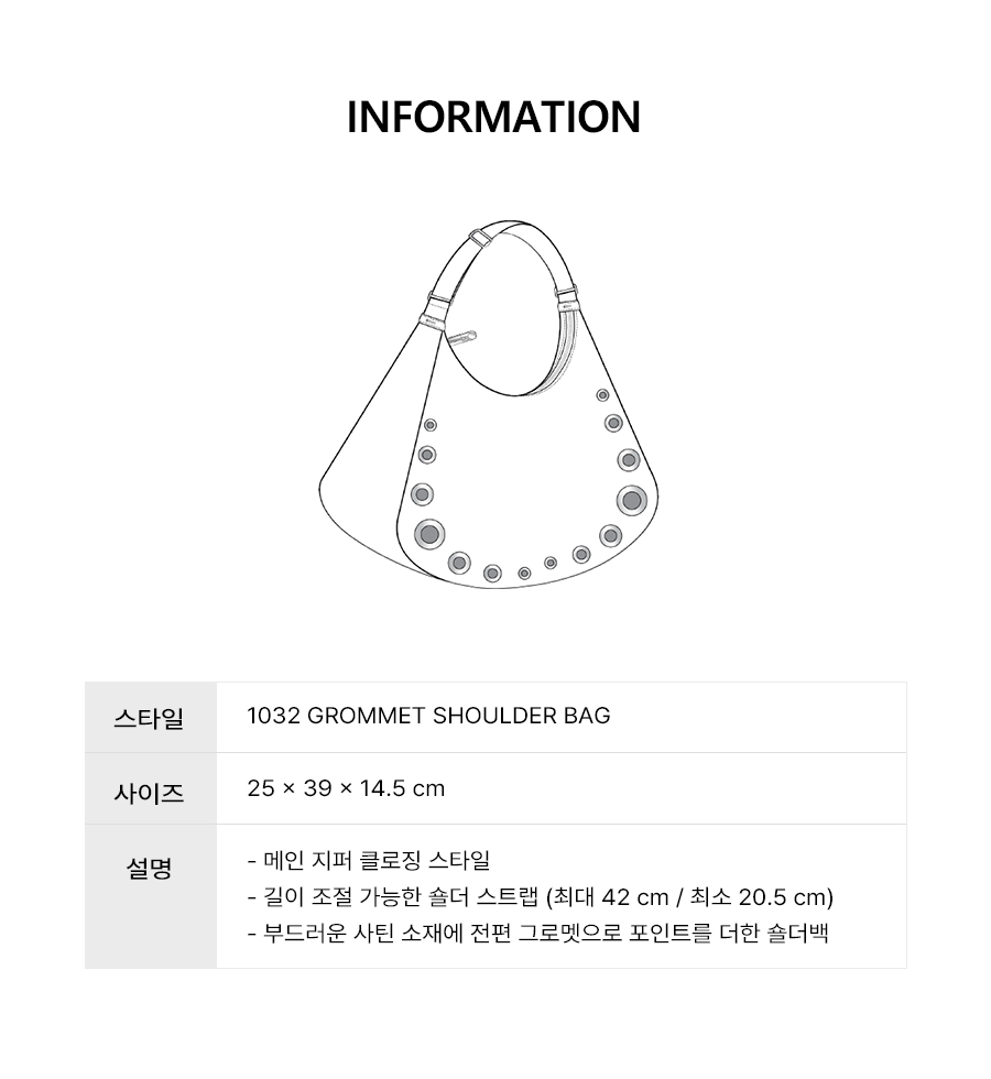 - 메인 지퍼 클로징 스타일 - 길이 조절 가능한 숄더 스트랩 (최대 42 cm / 최소 20.5 cm) - 부드러운 사틴 소재에 전편 그로멧으로 포인트를 더한 숄더백