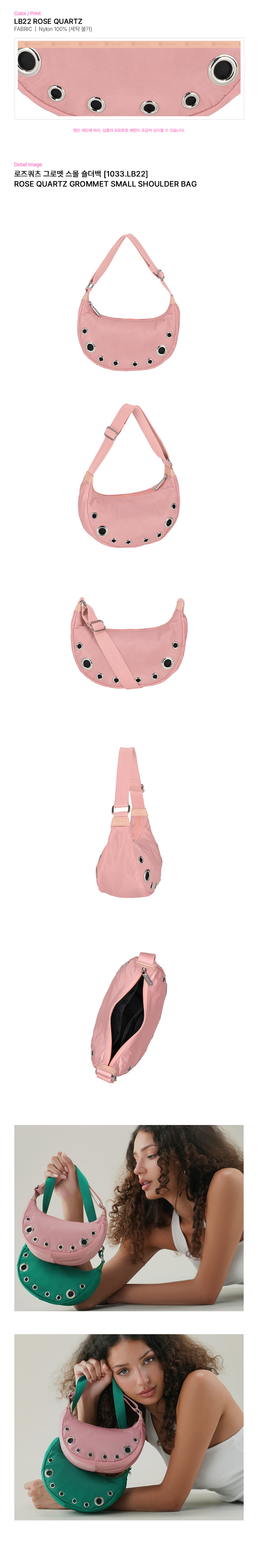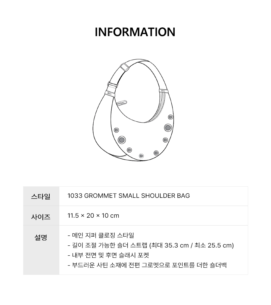 - 메인 지퍼 클로징 스타일 - 길이 조절 가능한 숄더 스트랩 (최대 35.3 cm / 최소 25.5 cm) - 내부 전면 및 후면 슬래시 포켓 - 부드러운 사틴 소재에 전편 그로멧으로 포인트를 더한 숄더백 |