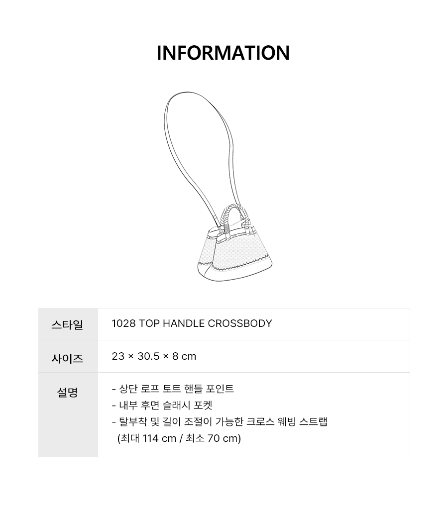 - 상단 로프 토트 핸들 포인트 - 내부 후면 슬래시 포켓 - 탈부착 및 길이 조절이 가능한 크로스 웨빙 스트랩 (최대 114 cm / 최소 70 cm) |