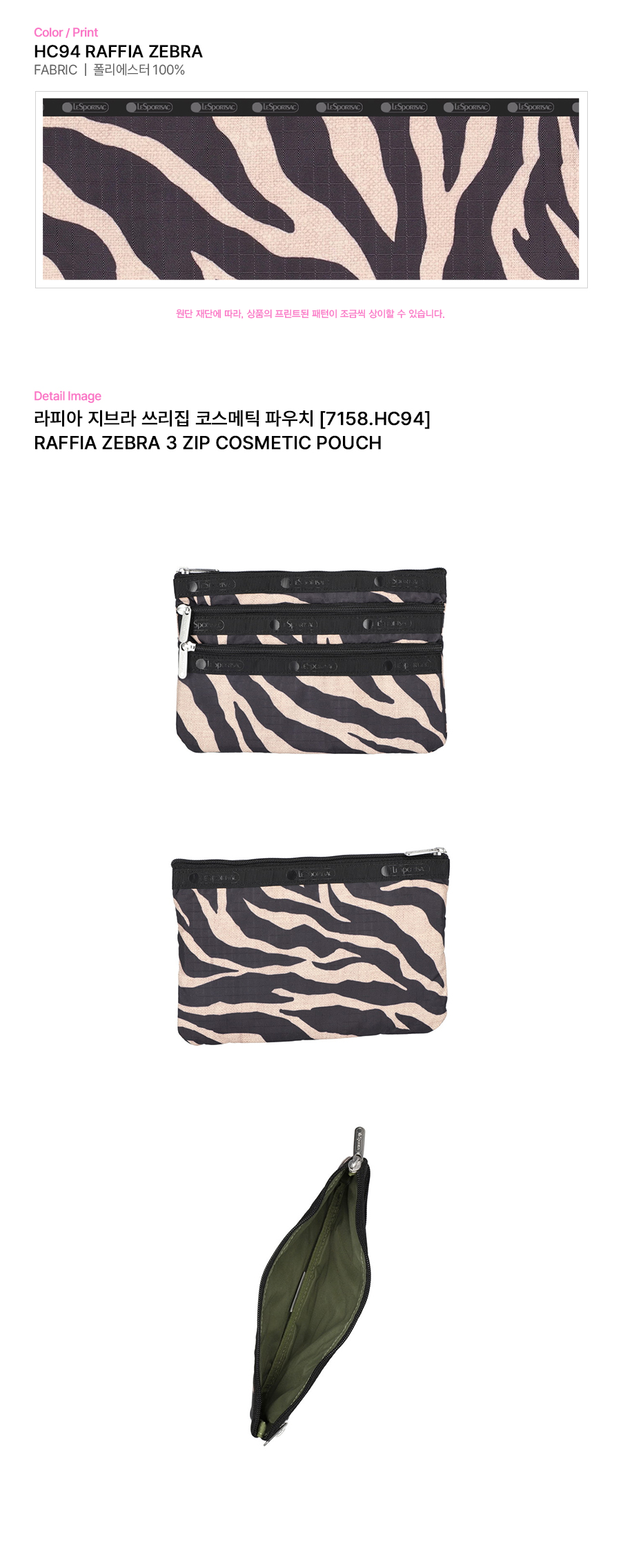 메인 지퍼 오프닝이며, 앞에 2개의 지퍼 주머니가 있는 총 3단의 지퍼 파우치이다. 각 주머니의 사이즈가 달라 종류별로 수납이 가능하다. |