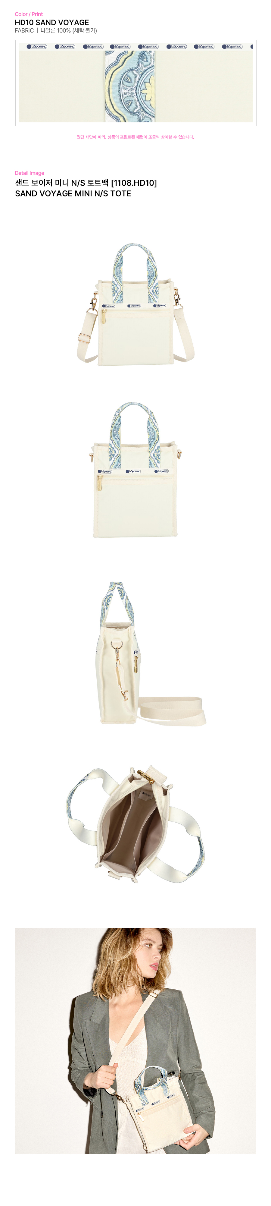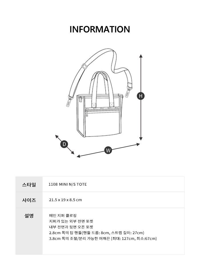 메인 지퍼 클로징 지퍼가 있는 외부 전면 포켓 내부 전면과 뒷면 오픈 포켓 2.8cm 폭의 탑 핸들(핸들 드롭: 8cm, 스트랩 길이: 27cm) 3.8cm 폭의 조절/분리 가능한 어깨끈 (최대: 127cm, 최소:67cm)