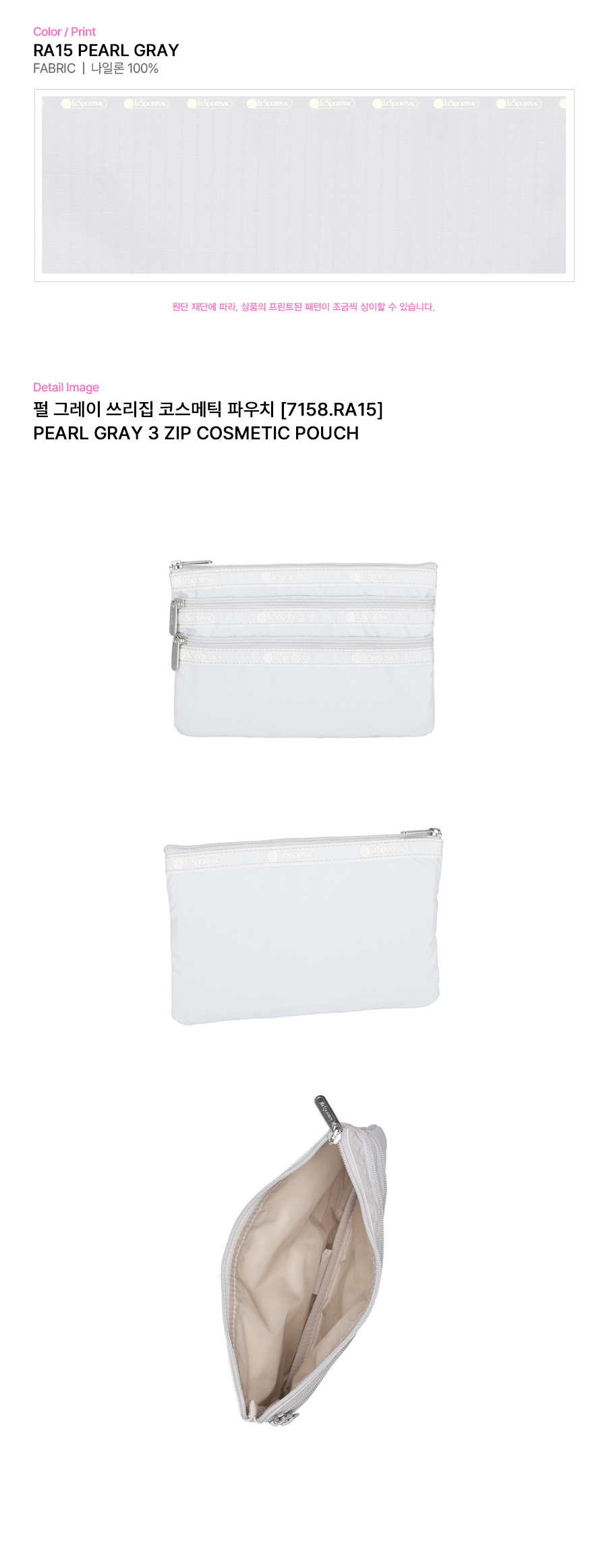 메인 지퍼 오프닝이며, 앞에 2개의 지퍼 주머니가 있는 총 3단의 지퍼 파우치이다. 각 주머니의 사이즈가 달라 종류별로 수납이 가능하다. |