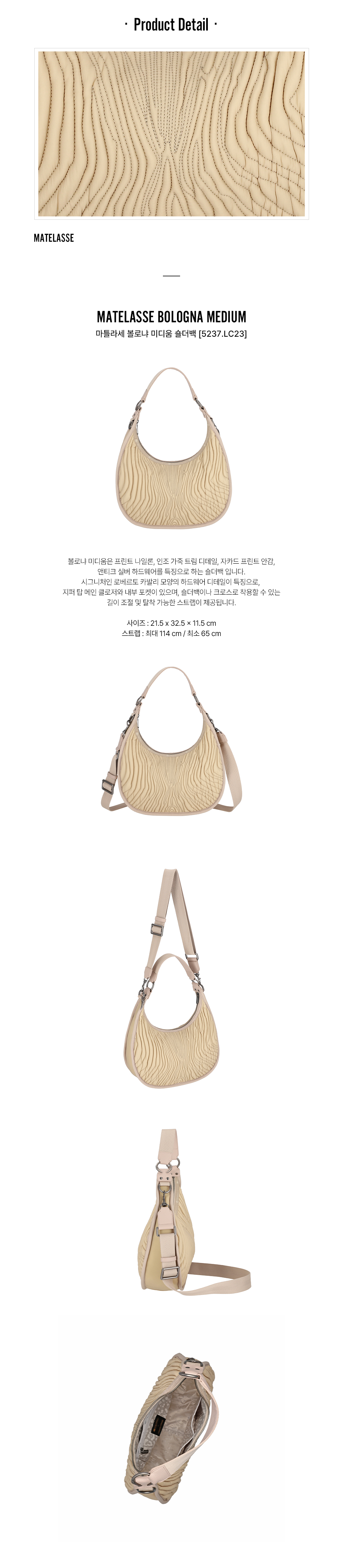 볼로냐 미디움은 프린트 나일론, 인조 가죽 트림 디테일, 자카드 프린트 안감, 앤티크 실버 하드웨어를 특징으로 하는 숄더백 입니다. 시그니처인 로베르토 카발리 모양의 하드웨어 디테일이 특징으로, 지퍼 탑 메인 클로저와 내부 포켓이 있으며, 숄더백이나 크로스로 착용할 수 있는 길이 조절 및 탈착 가능한 스트랩이 제공됩니다. 사이즈 : 21.5 x 32.5 x 11.5 cm 스트랩 : 최대 114 cm / 최소 65 cm