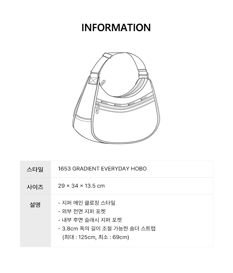 - 지퍼 메인 클로징 스타일 - 외부 전면 지퍼 포켓 - 내부 후면 슬래시 지퍼 포켓 - 3.8cm 폭의 길이 조절 가능한 숄더 스트랩 (최대 : 125cm, 최소 : 69cm)