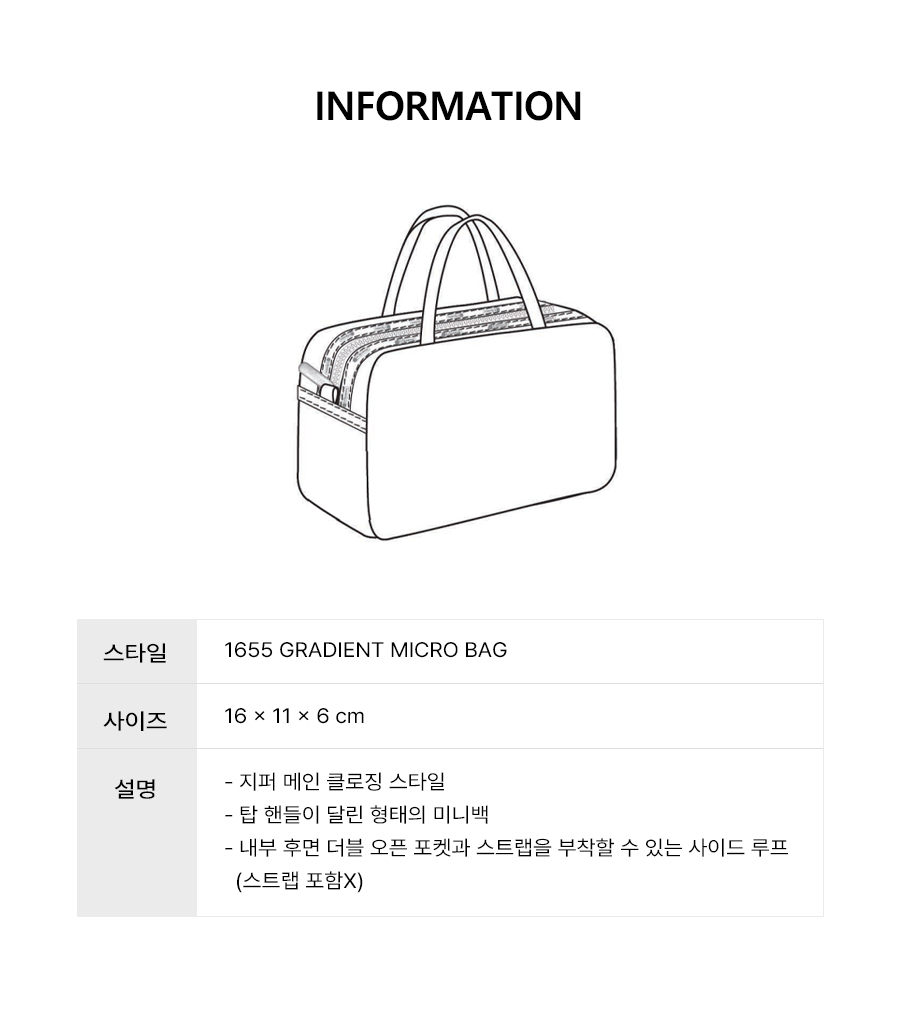 - 지퍼 메인 클로징 스타일 - 탑 핸들이 달린 형태의 미니백 - 내부 후면 더블 오픈 포켓과 스트랩을 부착할 수 있는 사이드 루프 (스트랩 포함X)