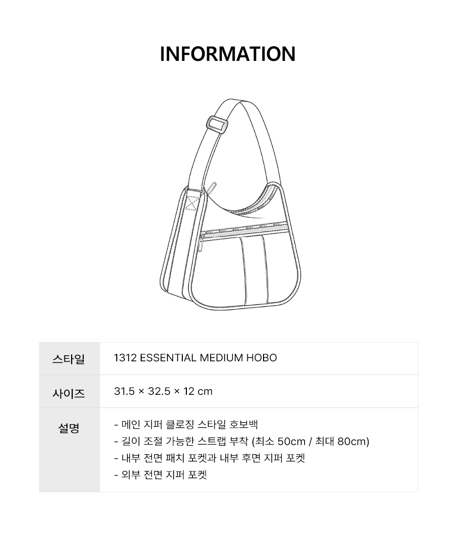 - 메인 지퍼 클로징 스타일 호보백 - 길이 조절 가능한 스트랩 부착 (최소 50cm / 최대 80cm) - 내부 전면 패치 포켓과 내부 후면 지퍼 포켓 - 외부 전면 지퍼 포켓