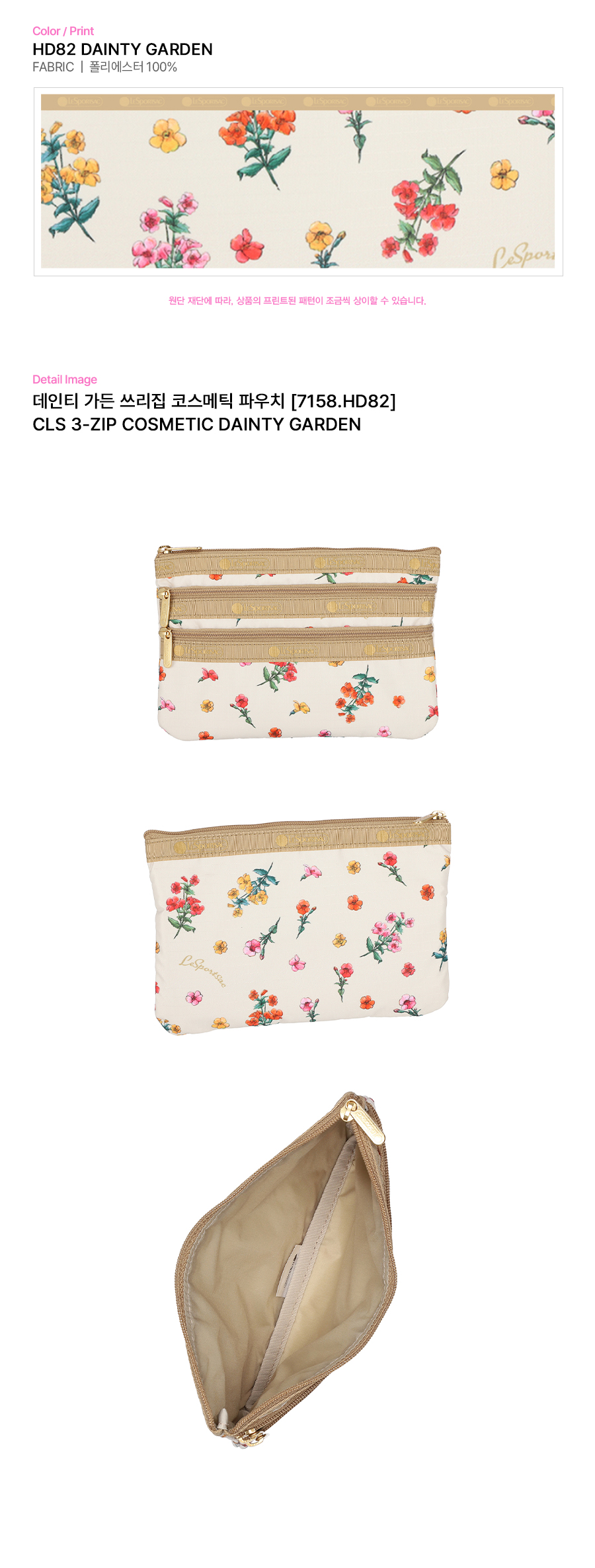 메인 지퍼 오프닝이며, 앞에 2개의 지퍼 주머니가 있는 총 3단의 지퍼 파우치이다. 각 주머니의 사이즈가 달라 종류별로 수납이 가능하다. |
