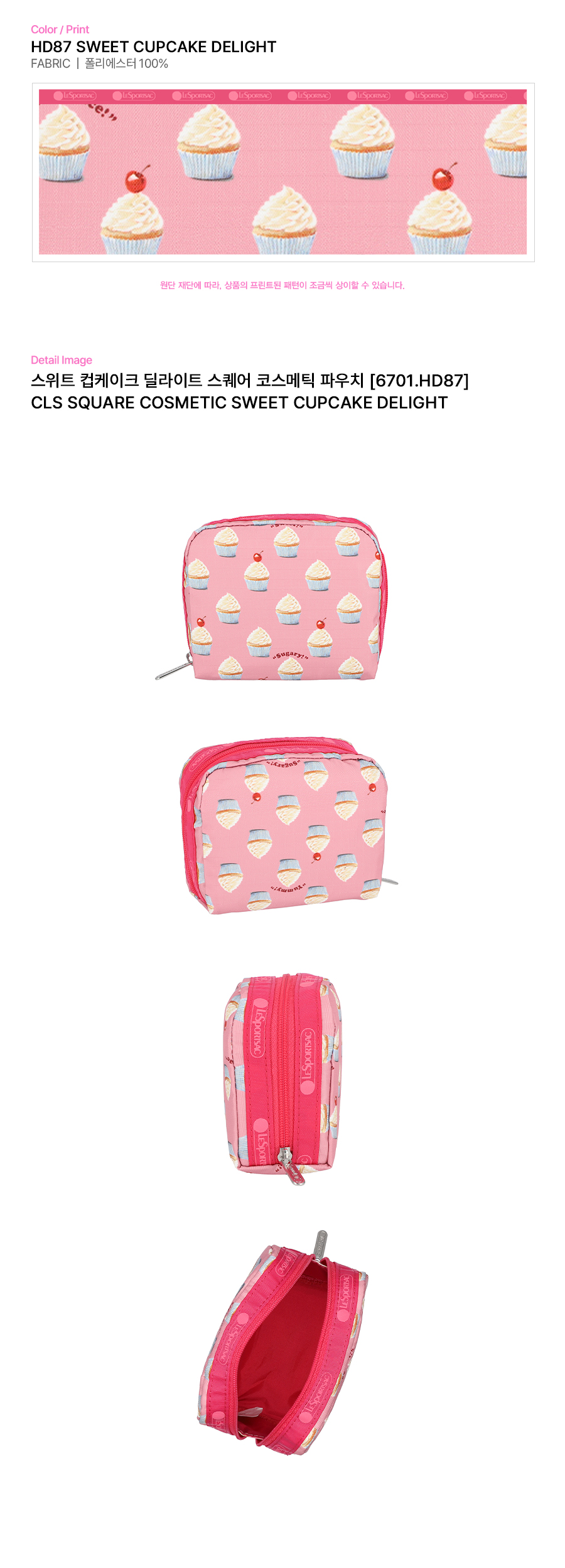정사각형 모양의 파우치로 지퍼 잠금 스타일이다. 화장품이나 여성용품 등 간단한 소지품을 수납하기에 좋다.