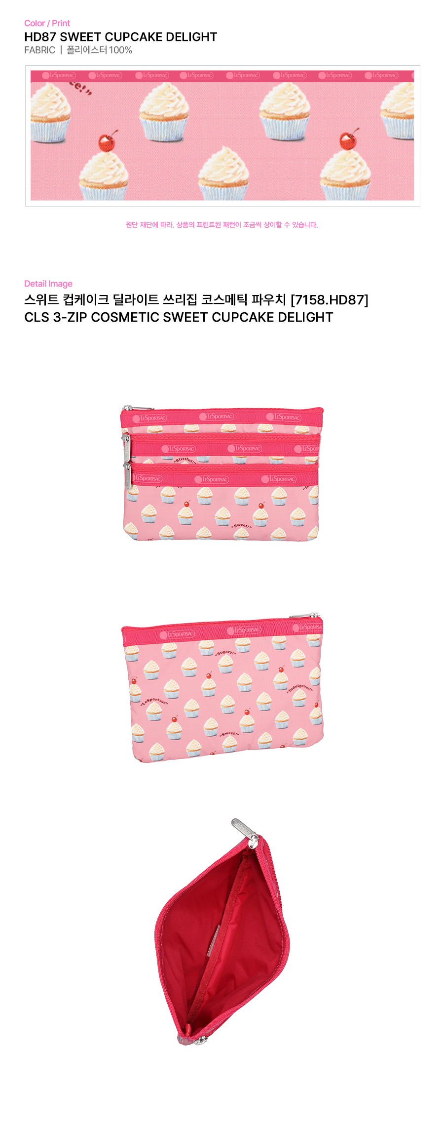 메인 지퍼 오프닝이며, 앞에 2개의 지퍼 주머니가 있는 총 3단의 지퍼 파우치이다. 각 주머니의 사이즈가 달라 종류별로 수납이 가능하다. |