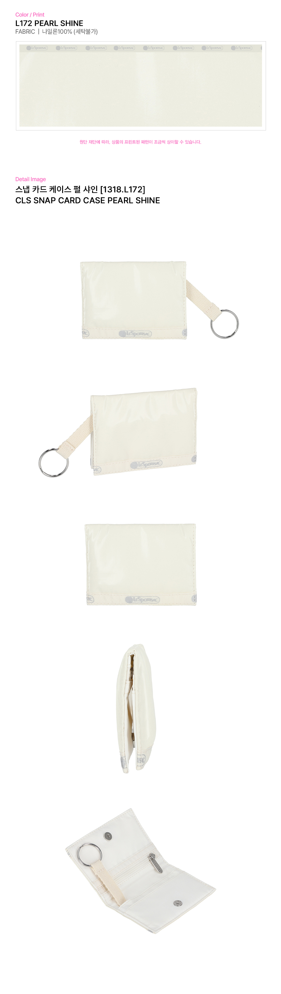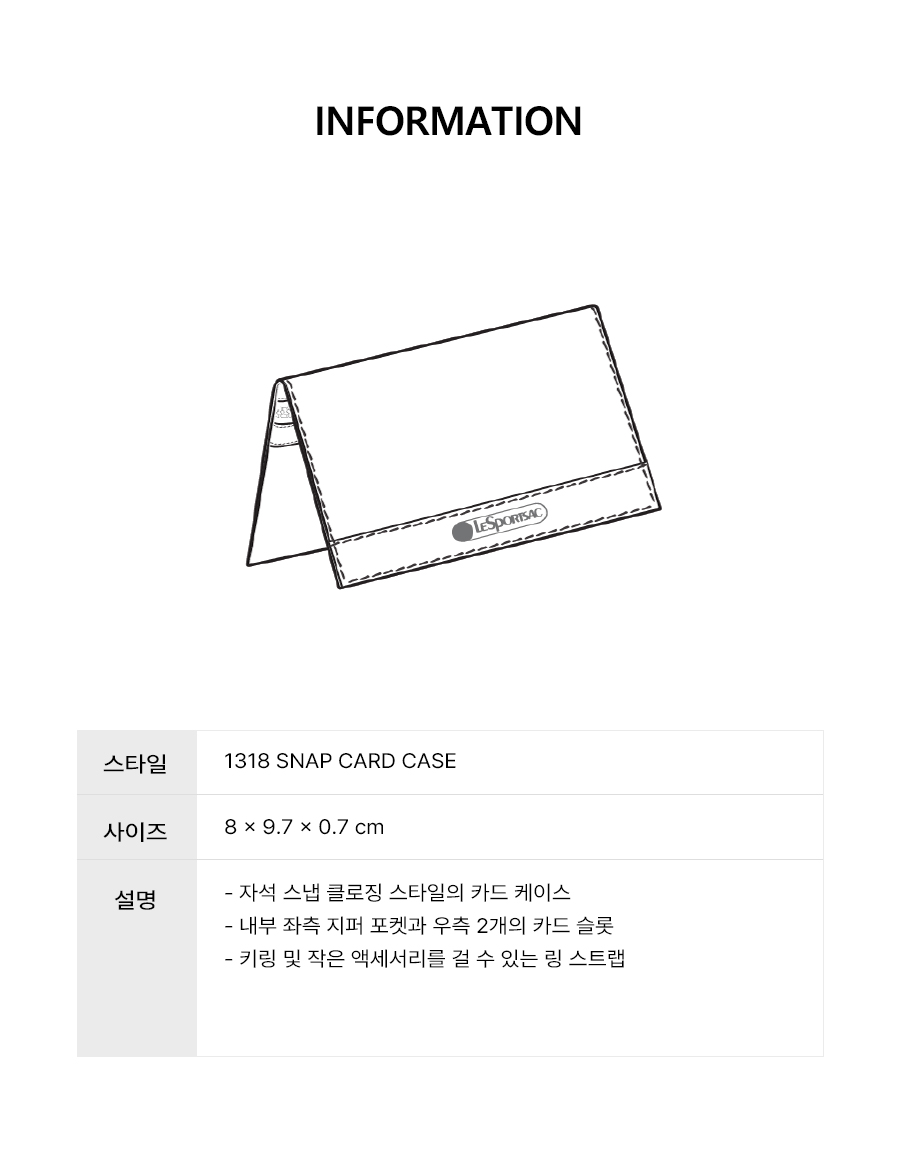 - 자석 스냅 클로징 스타일의 카드 케이스 - 내부 좌측 지퍼 포켓과 우측 2개의 카드 슬롯 - 키링 및 작은 액세서리를 걸 수 있는 링 스트랩 |