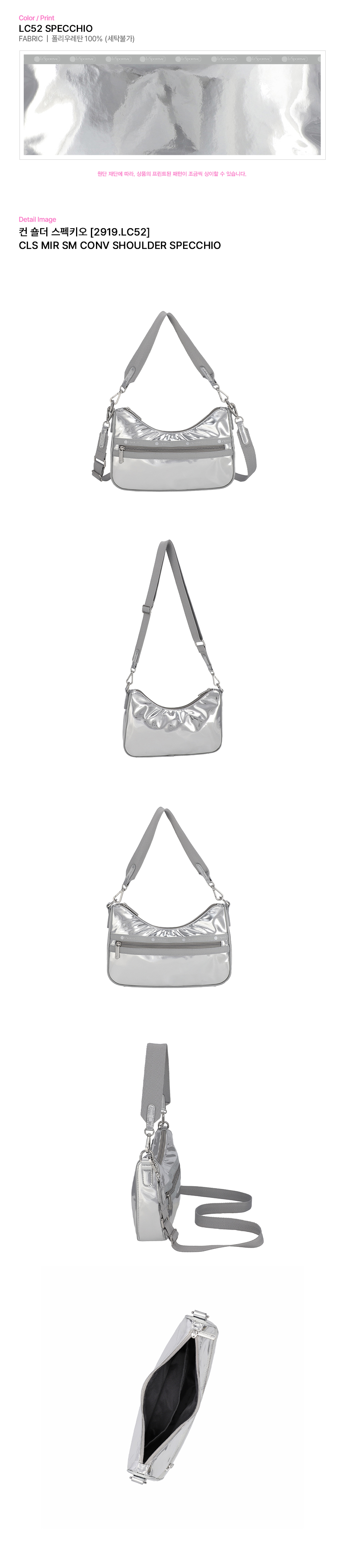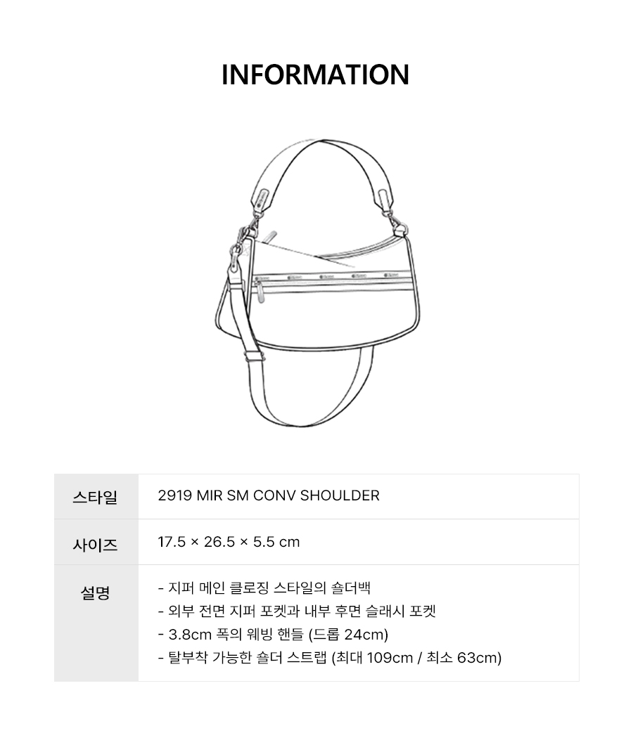 - 지퍼 메인 클로징 스타일의 숄더백 - 외부 전면 지퍼 포켓과 내부 후면 슬래시 포켓 - 3.8cm 폭의 웨빙 핸들 (드롭 24cm) - 탈부착 가능한 숄더 스트랩 (최대 109cm / 최소 63cm)