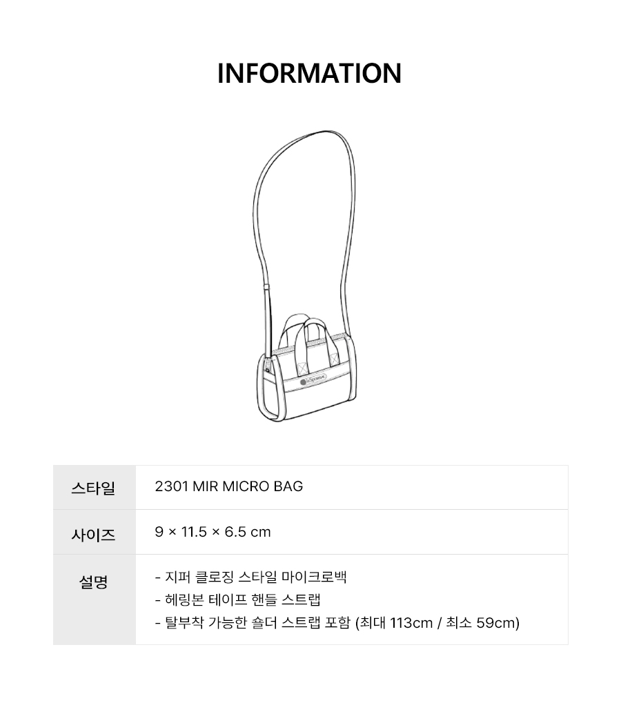 - 지퍼 클로징 스타일 마이크로백 - 헤링본 테이프 핸들 스트랩 - 탈부착 가능한 숄더 스트랩 포함 (최대 113cm / 최소 59cm)