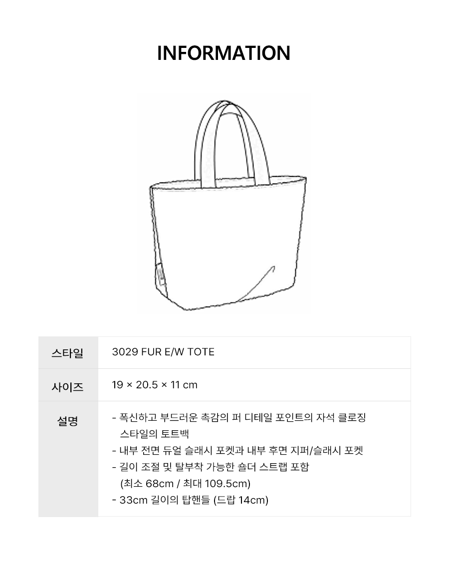 - 폭신하고 부드러운 촉감의 퍼 디테일 포인트의 자석 클로징 스타일의 토트백