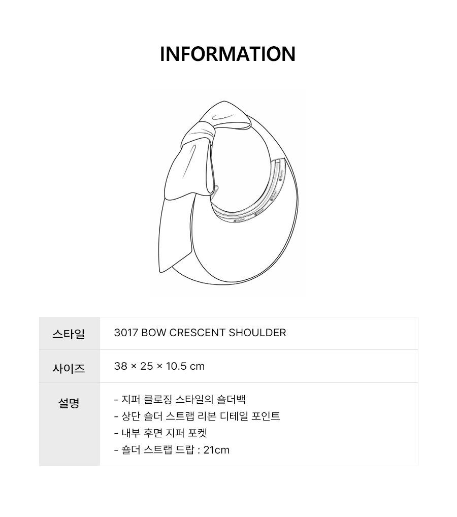 - 지퍼 클로징 스타일의 숄더백 - 상단 숄더 스트랩 리본 디테일 포인트 - 내부 후면 지퍼 포켓 - 숄더 스트랩 드랍 : 21cm
