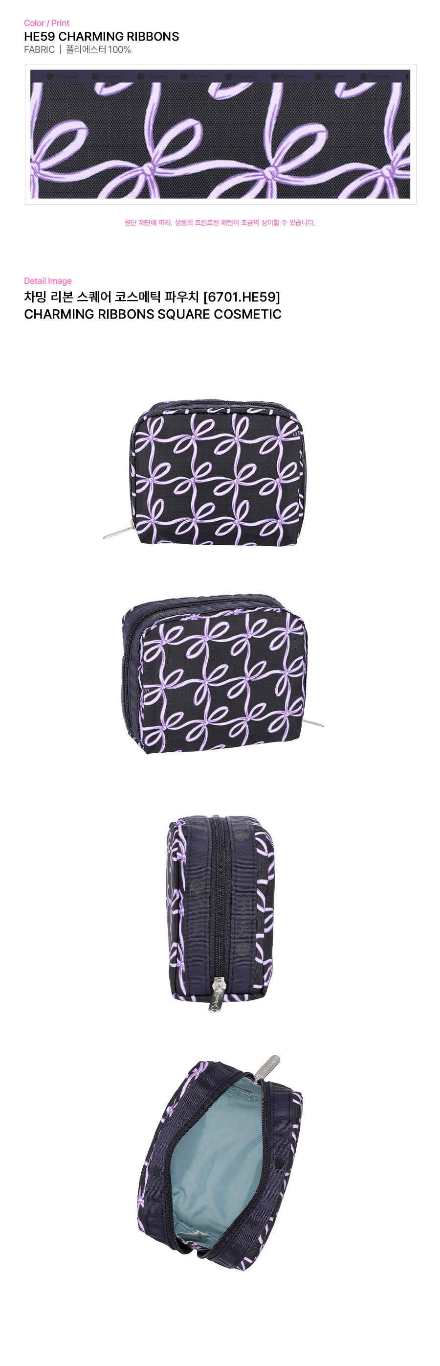 정사각형 모양의 파우치로 지퍼 잠금 스타일이다. 화장품이나 여성용품 등 간단한 소지품을 수납하기에 좋다.