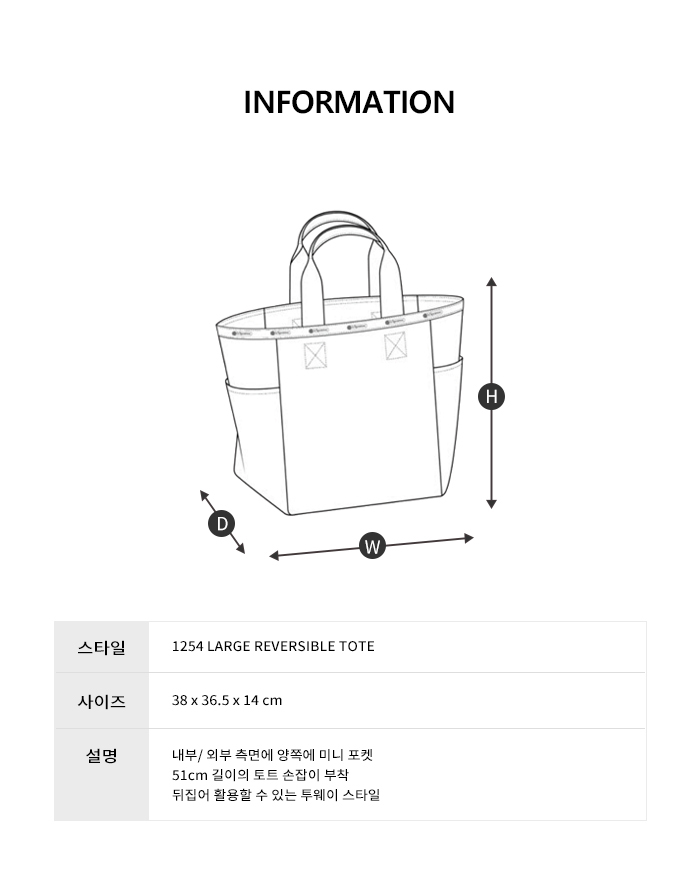 내부/ 외부 측면에 양쪽에 미니 포켓 51cm 길이의 토트 손잡이 부착 뒤집어 활용할 수 있는 투웨이 스타일