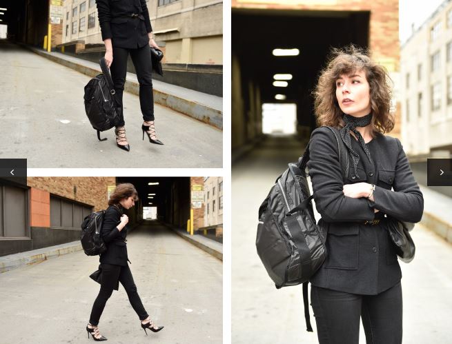 박시한 스타일의 자켓에 레이스업 슈즈와 블랙 백팩을 매치하여 시크한 올 블랙 룩을 완성