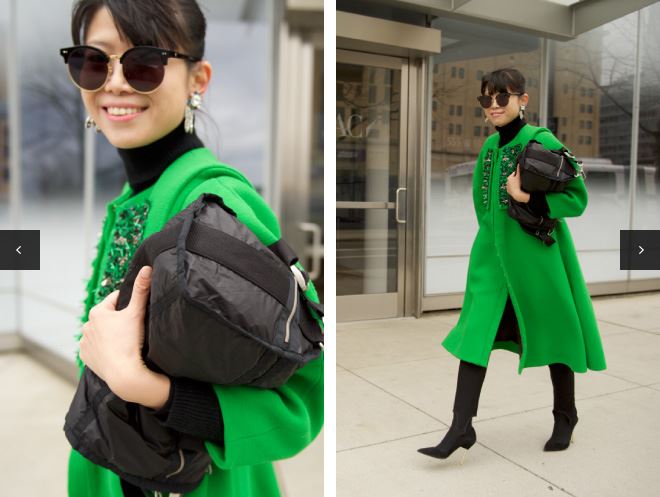 화려한 장식이 돋보이는 비비드한 그린 컬러의 드레스 코트, 시크한 블랙 백, 여성스러움이 느껴지는 스틸레토와 비쥬 이어링의 조합