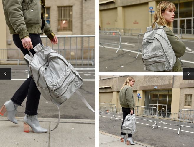 실버 백팩과 동일한 컬러의 아크릴 소재의 부츠 스타일의 결합이 미래 지향적인 무드를 완성하는데 플러스